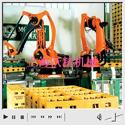 鏈式輸送器將裝滿產品的箱子輸送至機器人的抓取位置。KR 180 PA 用它那可以抓住箱子側邊抓取槽的鉤式夾持器每次抓起 4 個箱子,并將其放在一個歐洲標準貨盤上。歐洲標準貨盤完全裝滿后,就通過輥道被往前輸送到一個轉角工位,該工位也作為叉車的雙重提取位置。 9xn上海沃精機械制造有限公司