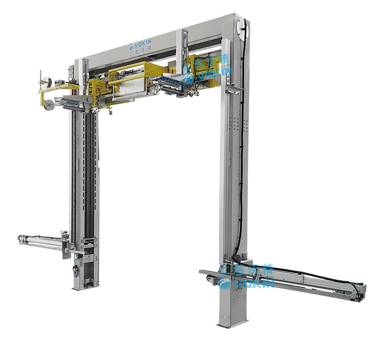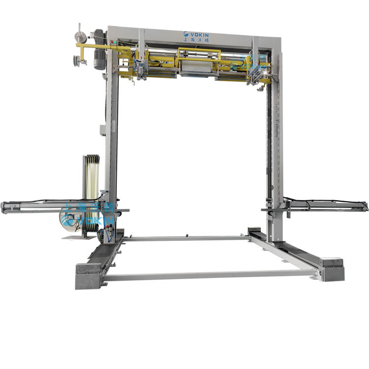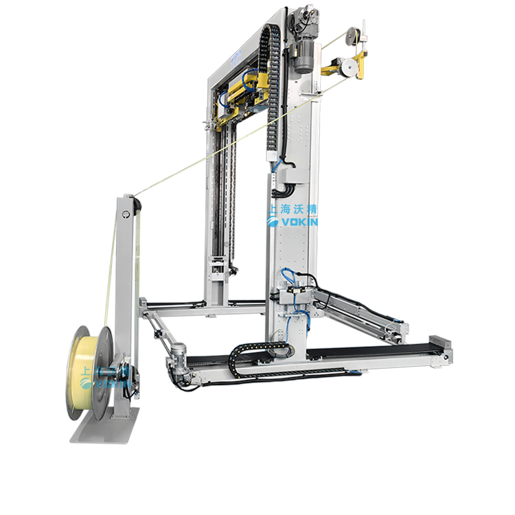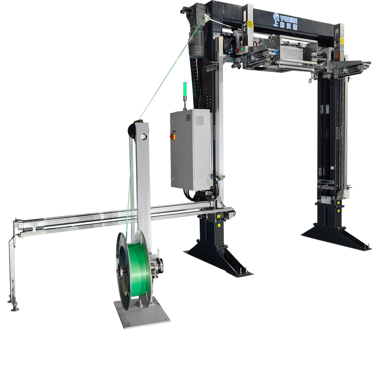 移動式打帶機可以自動尋找打帶位置并且配合打帶機底部的旋轉臺輸送機,可以完成井字型打帶,并且可短護角保護產品不被打包帶損傷。